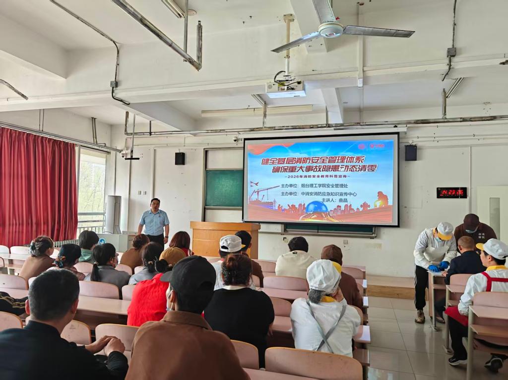 为切实强化校园经营场所及学校餐厅的消防安全管理,提升从业人员与师生的应急避险能力,2026年4月21日下午两点,消防应急中心曲教官受邀走进烟台理工学院,为学校内餐厅及商铺的负责人、员工开展了一场针对性极强的消防安全专题培训,全力守护校园安全环境。